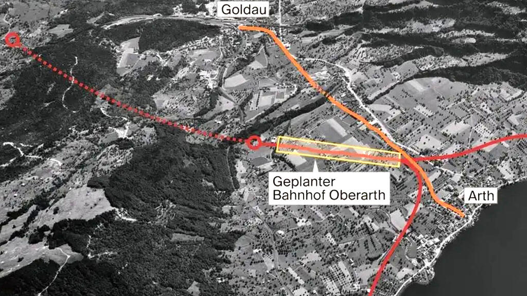 Flugaufnahme Talkessel Arth von 1968. Das nie realisierte Projekt samt Goldauer Tunnel (gestrichelt, schematisch) ist rot eingetragen. Orange markiert ist die 1959 eingestellte Talbahnstrecke («Arther Trämli»), welche ursprünglich den untersten Teil der 1875 eröffneten Arth-Rigi-Bahn bildete und heute als Wander- und Veloweg dient.