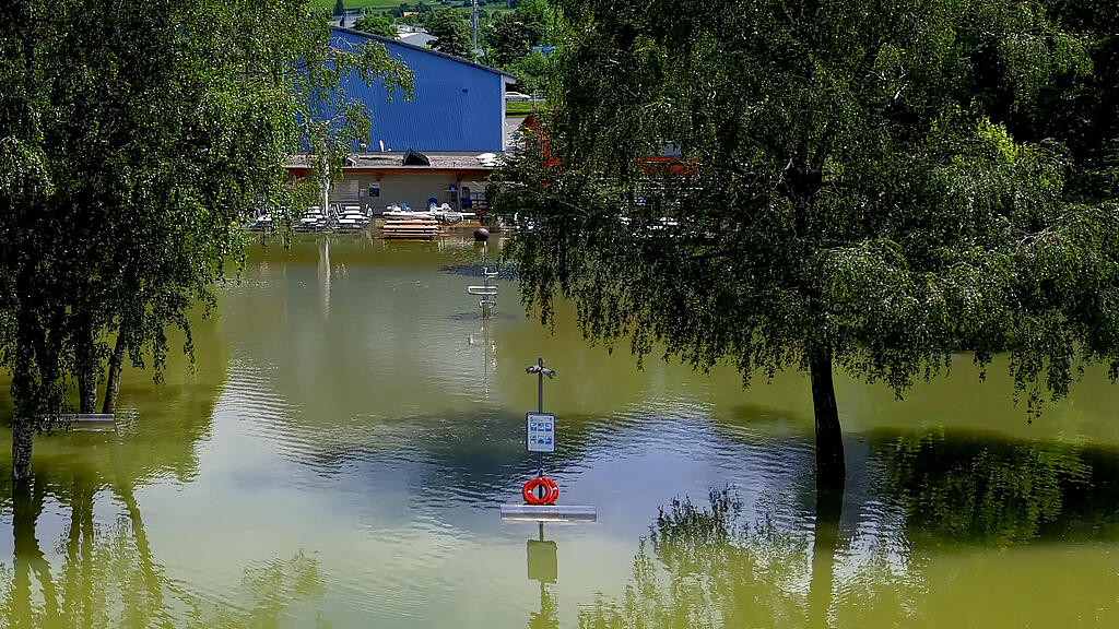 Unsere Aufnahmen zeigen das Badi-Areal kurz nach 12 Uhr. Noch immer war die Zufahrt via Seemattliweg gesperrt. Das Hochwasser überschwemmte auch einen Teil der Parkplätze. gh