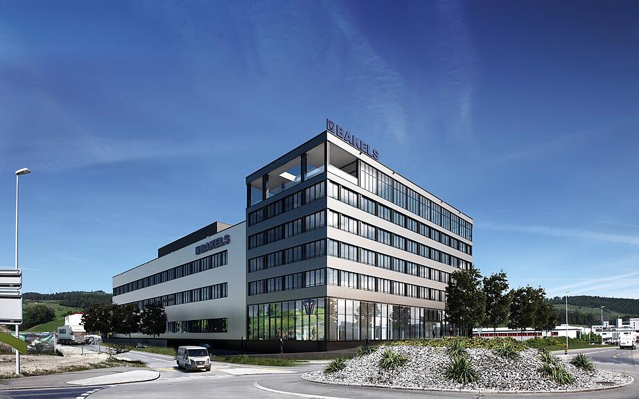 «Die klare Volumetrie der Baustruktur wird durch eine elegante Metallverkleidung und horizontal gegliederte Fensterbänder, sogenannte Pastellbänder, akzentuiert. Gezielte Verglasungen in dezenten Farbtupfern sollen dabei an das Corporate Design der Firma Bakels erinnern», hält der Schwyzer Architekt weiter fest.