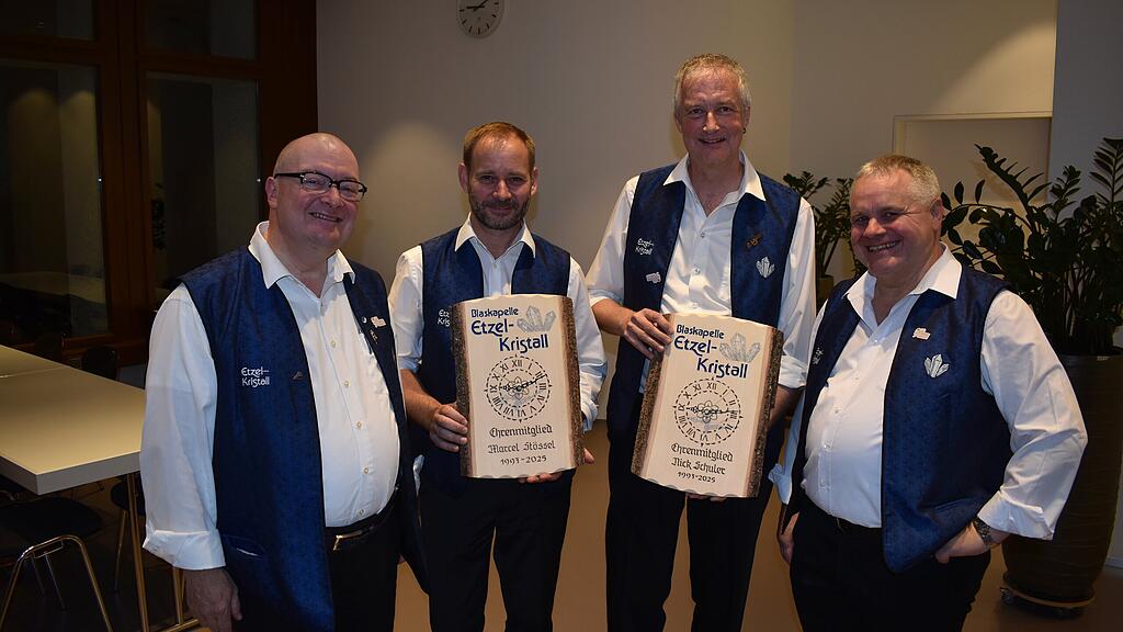 Marcel Stössel (Zweiter von links) und Nik Schuler (Zweiter von rechts) wurden von Präsident Christoph Huber (links) und Dirigent Toni Gräzer (rechts) verabschiedet und zu Ehrenmitgliedern ernannt.