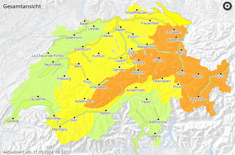 Es kann zu steigenden Wasserpegeln von Bächen, Flüssen und Seen kommen. Lokal besteht Überschwemmungsgefahr. Bachläufe in den Bergen sowie Ufergebiete von Fliessgewässern sind zu meiden. In den Bergen besteht ausserdem erhebliche Lawinengefahr.