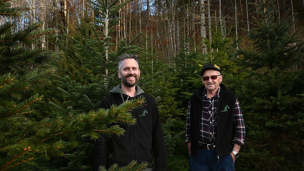 Veit Kälin (links) und Fredi Fuchs inmitten ihrer Nordmanntannen in Egg.