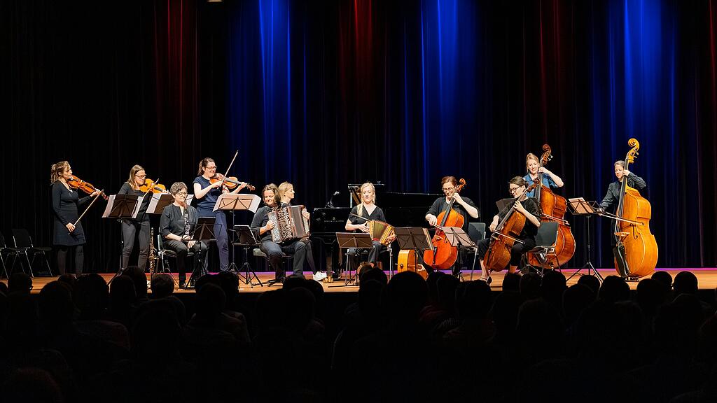 Hanna Landolt (Violine, von links), Maria Gehrig (Violine, Blockflöte), Gaby Näf (Klarinette, Saxofon), Madlaina Janett (Violine, Bratsche), Andrea Ulrich (Akkordeon), Patricia Ulrich (Klavier), Kristina Brunner (Schwyzerörgeli, Cello), Cristina Janett (Cello), Barbara Gisler (Cello, Kontrabass), Evelyn Brunner (Kontrabass) und Martina Rohrer (Kontrabass).