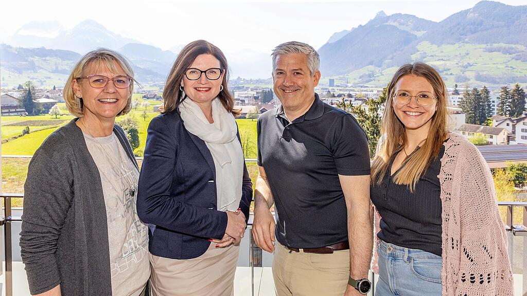 Rita Bruhin (Zweite von links) vom Alterszentrum Rubiswil Ibach und Lukas Gisler vom Alterszentrum Acherhof Schwyz, die den Talkessel-Pool lanciert haben, zusammen mit Sonja Andermatt, Leitung Pflege und Betreuung Alterszentrum Rubiswil (links) und Simone Abderhalden (rechts), stellvertretende Verantwortliche HR Stiftung Acherhof.