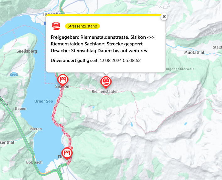 Am Dienstagmorgen strahlte wieder die Sonne. Ideale Voraussetzungen für einen Reko-Flug mit dem Helikopter, dieser war auf 8 Uhr terminiert. Nach dem Mittag dann die Meldung: Die Strecke zwischen Flüelen und Sisikon konnte auf 14 Uhr wieder freigegeben werden. Der Abschnitt der Axenstrasse zwischen Brunnen und Sisikon bleibt aber gesperrt, Dauer unbestimmt.