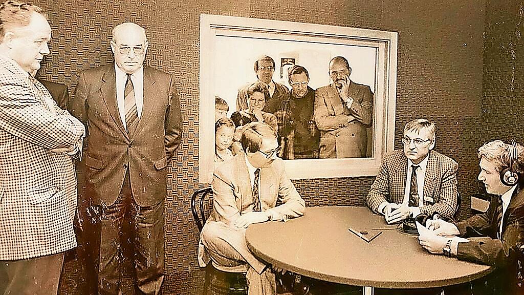 Zusammen mit Politprominenz, dem damaligen Landammann Franz Marty (Dritter von links) und Verwaltungsratspräsident Hans Paul Zangerl (Zweiter von rechts) eröffnete Geschäftsführer Alfons Spirig (rechts) Radio Schwyz. Bild: Archiv