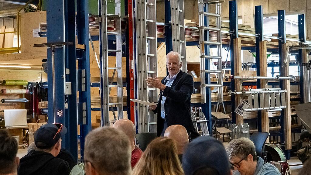 Hans Bless, Vorsitzender der Geschäftsleitung, referierte am Sonntag vor den Mitarbeitenden in der Betriebszentrale Muotakraftwerke.