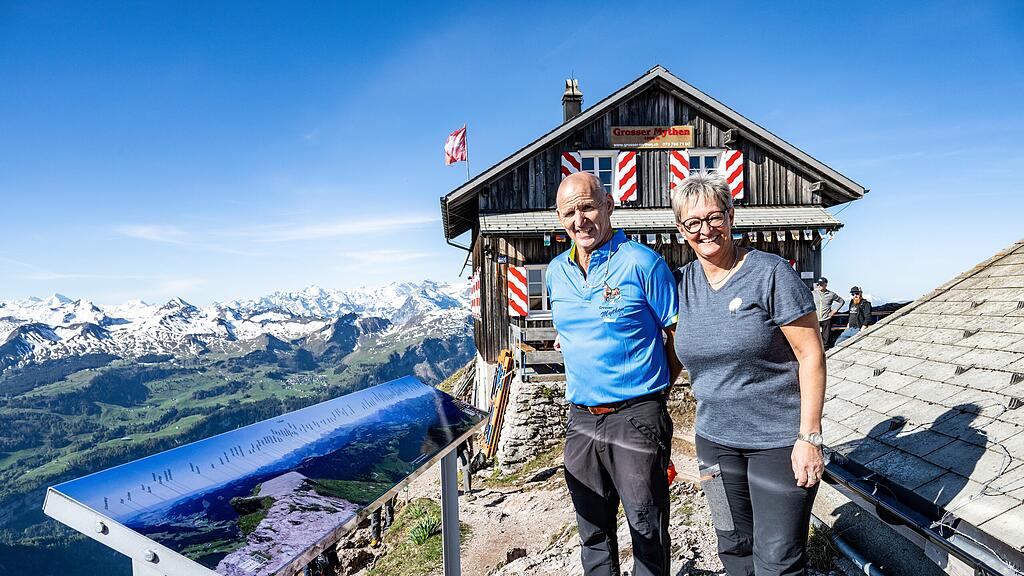 Am Samstag, 11. Mai, fanden die Mythenversorgung und die Wegeröffnung statt. Das Hüttenpaar Werner Ruhstaller und Annagreth Schuler mit den neuen Panoramatafeln.