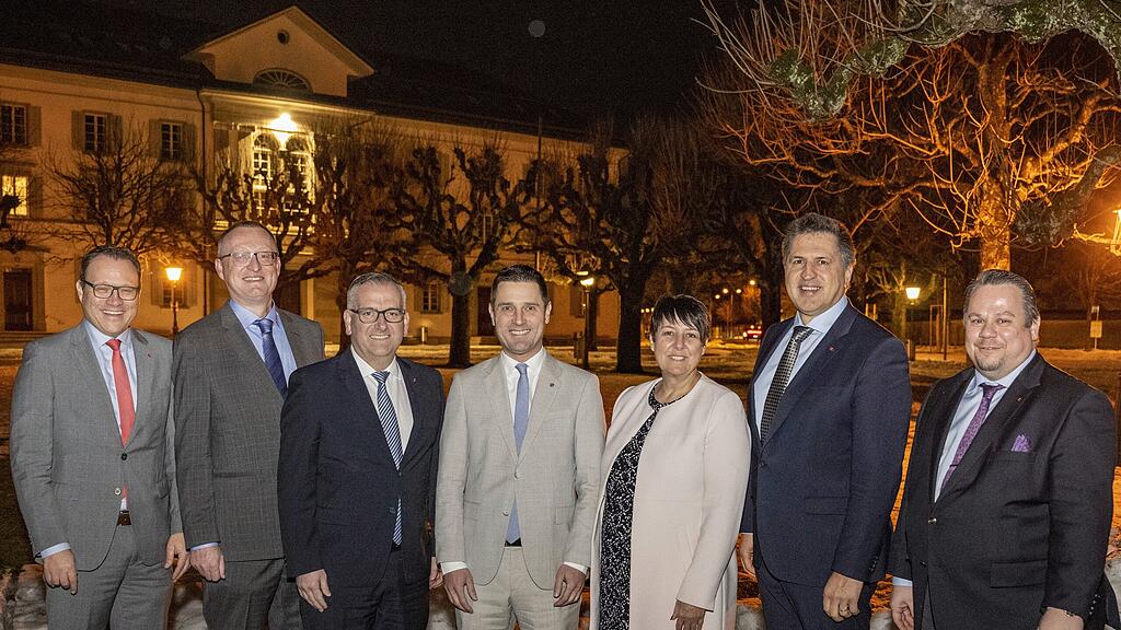Die Gesamtregierung des Kantons Schwyz (von links) mit Damian Meier, Herbert Huwiler, Michael Stähli, André Rüegsegger, Petra Steimen-Rickenbacher, Sandro Patierno und Xaver Schuler anlässlich des Mediengesprächs in Einsiedeln.