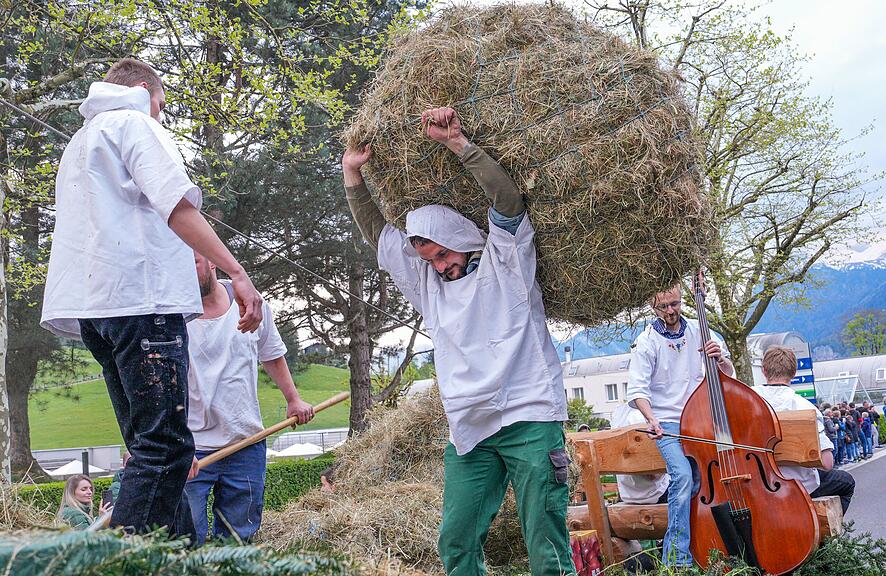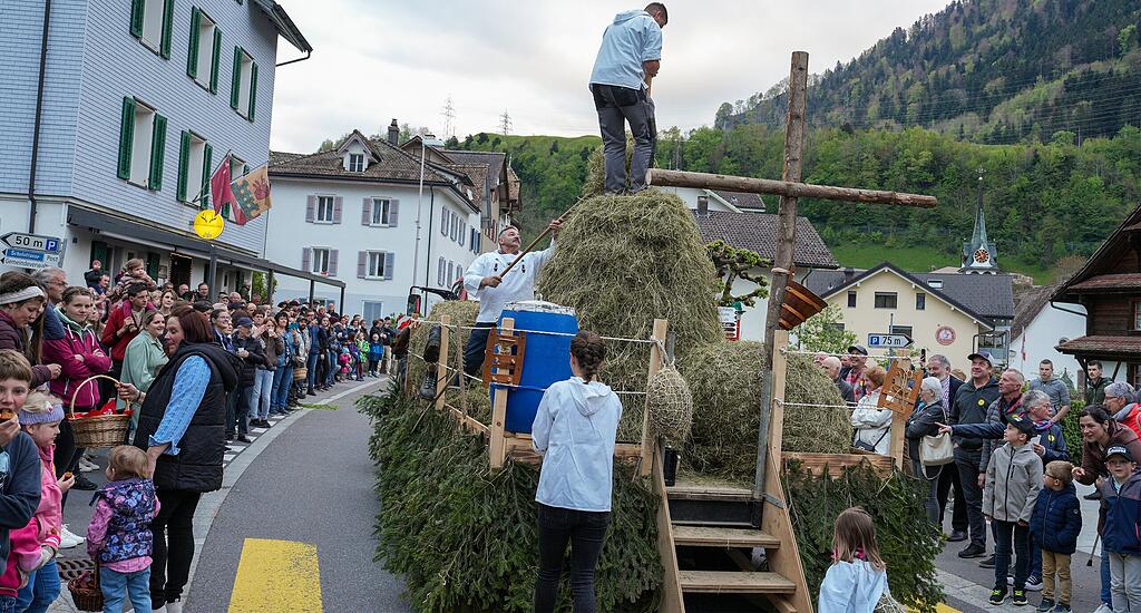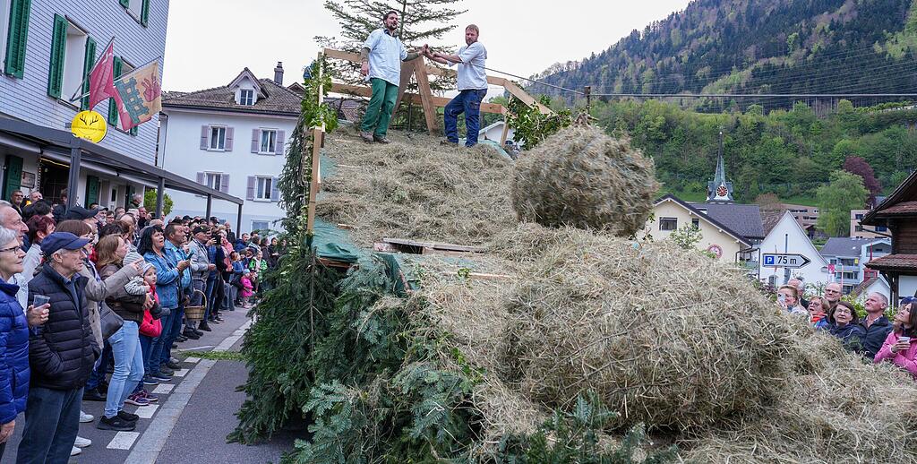 Für einmal wurde nun dieser Bergheuet nicht auf abschüssigen Hängen, sondern mitten im Dorf Morschach den vielen hundert Besuchern hautnah demonstriert. Alles, was mit dem Wildiheuen zusammenhängt, stand im Mittelpunkt des Umzuges. Natürlich auch schön geschmücktes Vieh und vieles mehr rund um Landwirtschaft und Brauchtum verschönerten das Gezeigte. Mit Tanz und Unterhaltung in und um die Mehrzweckhalle «chilbeten» die Einheimischen und Besucher weiter.