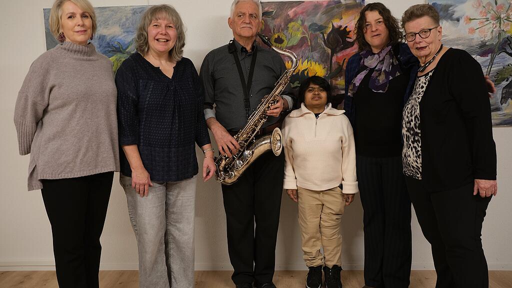 Die Galeristinnen Cornelia Kunz (von links) und Irène Hänni, Musiker Eugen Herger, Angeline Eva Eck, Bri Bolinger (eines ihrer Bilder im Hintergrund) und Elisabeth Herger.