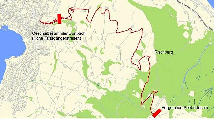 Die Sperrung der Seebodenstrasse erfolgt zwischen dem Geschiebesammler Dorfbach und der Bergstation der Luftseilbahn Seebodenalp.