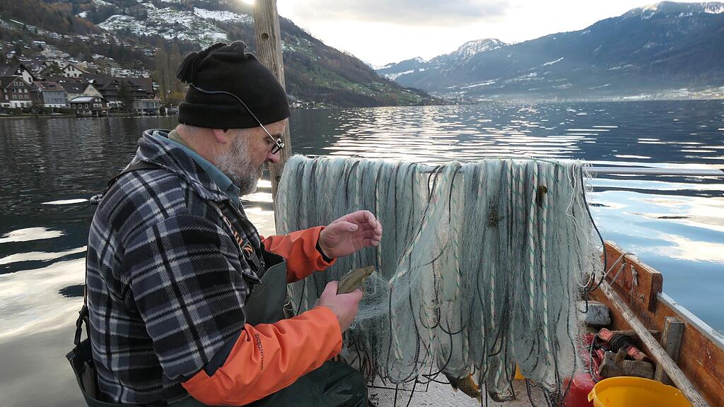 Kaum ein Kräuseln auf der Wasseroberfläche. Der Zugersee ist an einem Morgen Ende November fast spiegelglatt. Die verschneite Rigi leuchtet in der ersten Morgensonne. Ruhig sind auch die Abläufe von Berufsfischer Toni Hürlimann aus Walchwil auf seinem Motorboot. Er zieht das 60 bis 70 Meter lange Seil, an dem das Netz hängt, in runden, rhythmischen Bewegungen ein. Scheinbar leicht. Doch daran hängt das ganze Stellnetz, das der Fischer am Vortag gesetzt hat.