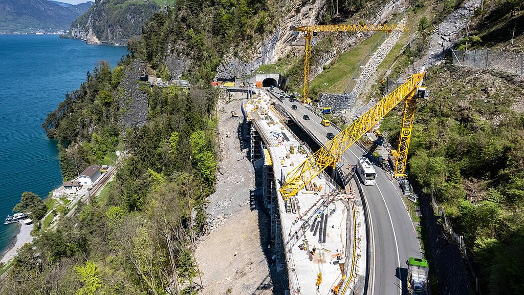 Am Gumpisch ist parallel zur bestehenden Brücke eine Hilfsbrücke im Bau. Das Bild zeigt die Axenstrasse am Vierwaldstättersee Richtung Brunnen .