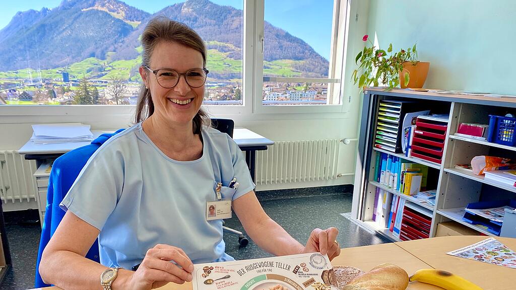 Ein Teller sollte ausgewogen sein: Ernährungsberaterin Regula Klinger-Graf zeigt in ihrem Büro im Spital Schwyz eine entsprechende Grafik.