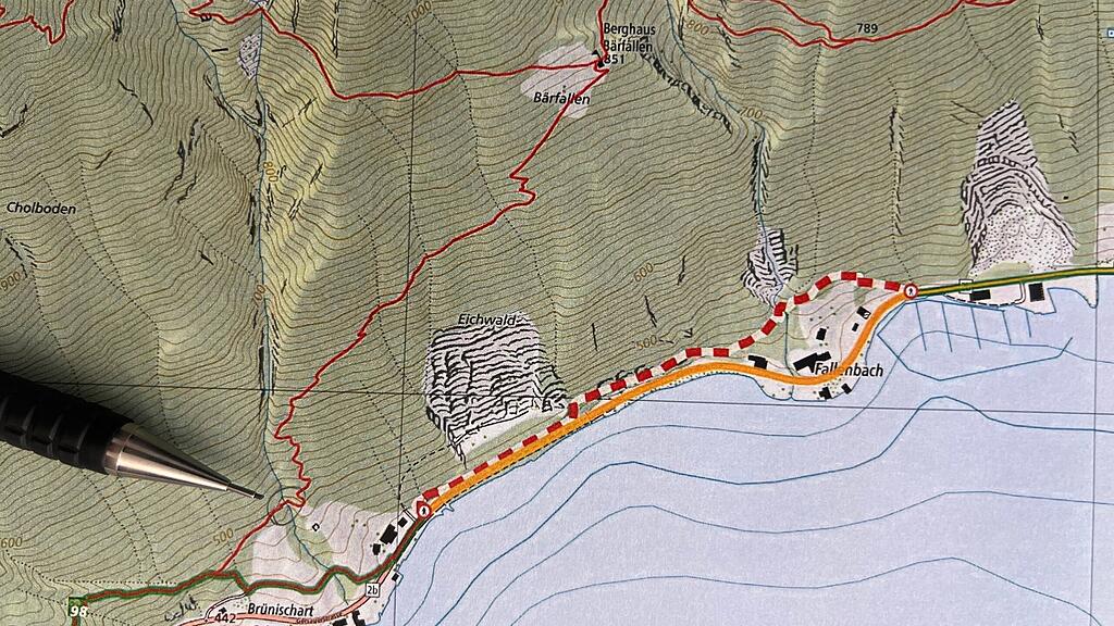 Die Brücke im Brünischart in Brunnen (siehe Bleistiftspitz) muss für 45’000 Franken saniert werden. Die bestehende Brücke weist erhebliche Sicherheitsmängel auf. Die hohen Kosten sind dem unwegsamen Gelände geschuldet, Bauherrschaft ist die Gemeinde Ingenbohl. Rot-weiss ist der Wanderweg zu sehen, der wegen Steinschlag für immer gesperrt werden musste.