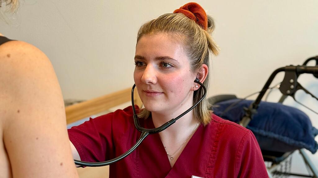 Herz und Lunge abhören: Elena Steiner, diplomierte Pflegefachfrau HF, Berufsbildnerin und Studierende Bachelor of Science, bei ihrer Arbeit im Alterszentrum Heideweg in Brunnen.