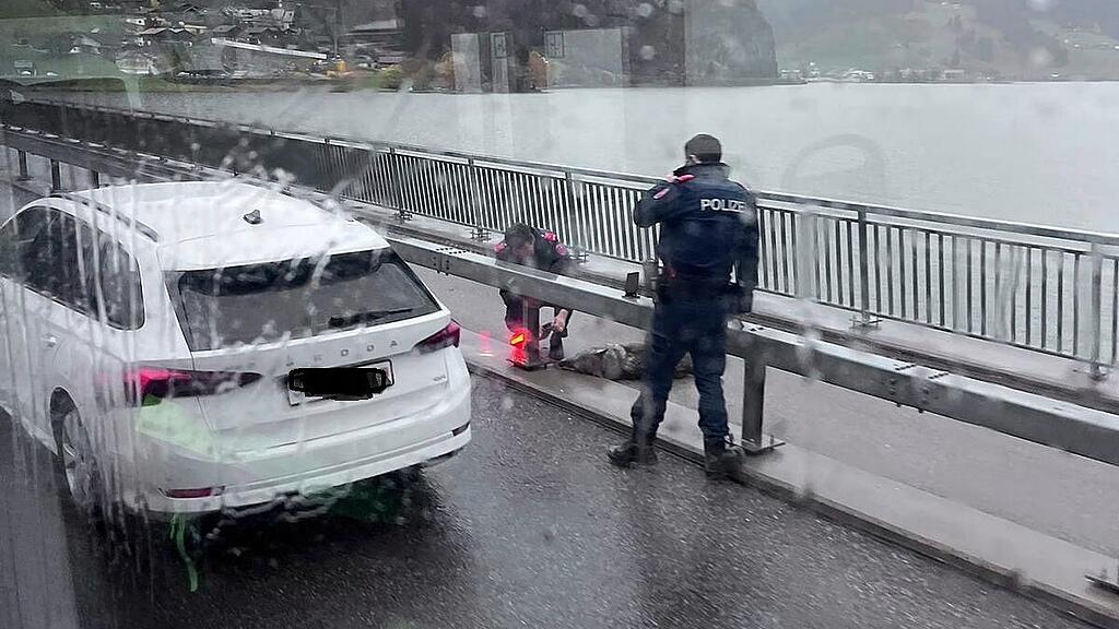 Zwei Polizisten kümmern sich um das tote Tier auf dem Viadukt bei Euthal.