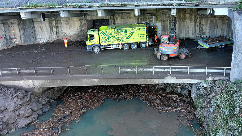 Emsiges Treiben auf der Axenstrasse zwischen Brunnen und Sisikon in dieser Woche. Bei der Schiefernegg-Galerie lag bis am Donnerstag noch immer liegt eine dünne Schlammschicht auf der Fahrbahn. Aufnahmen vom Vormittag zeigten aber, dass es vorwärtsging mit den Aufräumarbeiten. Mit einem Bagger wurde Material hinunter ins Wasser geschaufelt, ein Sauger-Lastwagen war ebenfalls mit Reinigungsarbeiten beschäftigt. Hier Aufnahmen aus der Luft.