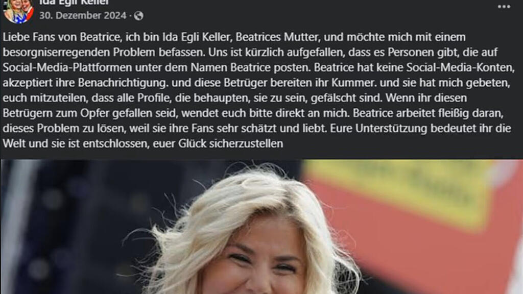 Unbekannte Täter geben sich auf Facebook als Mutter von Beatrice Egli aus. Sie wollen das Vertrauen der Fans gewinnen und finanzielle Vorteile erschleichen. Darüber berichtete die deutsche «Bild». Über gefälschte Profile werden angebliche VIP-Karten, Mitgliedschaften in Fanclubs oder sogar gemeinsame Ferien mit dem Star angepriesen. Die geforderten Beträge belaufen sich teilweise auf über tausend Franken.