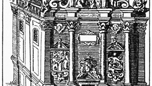 Ein Andachtsbild aus dem 17. Jahrhundert mit der 1798 zerstörten alten Gnadenkapelle in der Einsiedler Klosterkirche. Ob das «Türmlein»-Dokument von 1724 wohl im Sockel der Marienstatue am höchsten Punkt der Hauptfassade eingelegt wurde?
