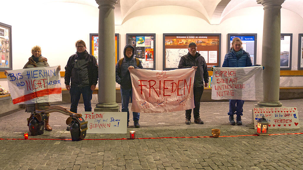 Seit gut einem Jahr versammeln sich jeweils am Montagabend ein paar Friedensaktivistinnen und -aktivisten unter den Bögen der Pfarrkirche St. Martin in Schwyz. «Und das werden wir bis auf Weiteres so machen», sagte eine Teilnehmerin im Gespräch mit dem «Boten» mit Blick auf die aktuelle Weltlage. Passanten steht man während der Mahnwache gerne Red und Antwort, alles in allem bleibt indes das Interesse an den Kundgebungen überschaubar.
