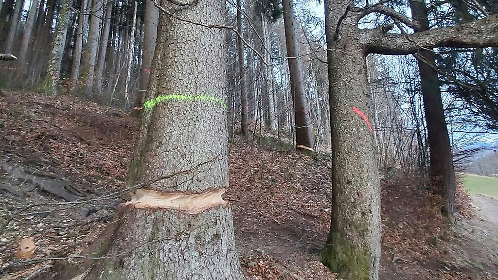 Zwischen Etzelpass und Hochetzel sind etwa 50 Bäume angezeichnet. Der Holzschlag umfasst sowohl normal zu fällende Bäume als auch sogenanntes Mondholz.
