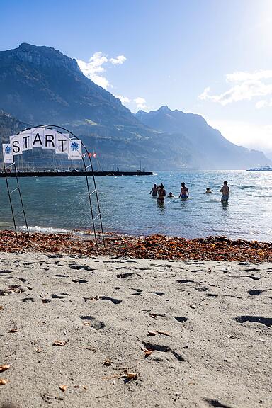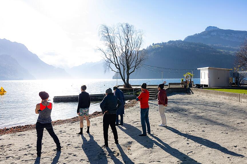 Nach dem Vortrag drehen sich die Gedanken von Sarah Zimmermann nur um Kälte und die Frage, ob sie sich überwinden kann. Martin Rohner erklärt, wie wichtig Füsse, Hände und Kopf in diesem Prozess sind, und gibt der Autorin Neoprenschuhe und eine Mütze. Nun darf sie endlich die ersten Schritte ins kalte Wasser wagen. Dann die Eiseskälte. Kurz will sie umdrehen. Doch gemeinsam mit den anderen der Anfängergruppe geht es Schritt für Schritt weiter. Es ist alles eine Frage der Einstellung – so geht sie bei jedem Ausatmen einen Schritt weiter und überwindet sich.