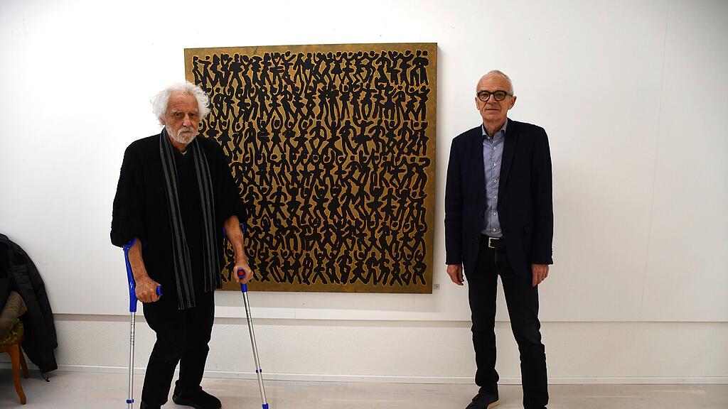 Alfons Bürgler (links) mit Laudator Roland Haltmeier neben einem seiner zahlreichen Körperschriften-Bilder.