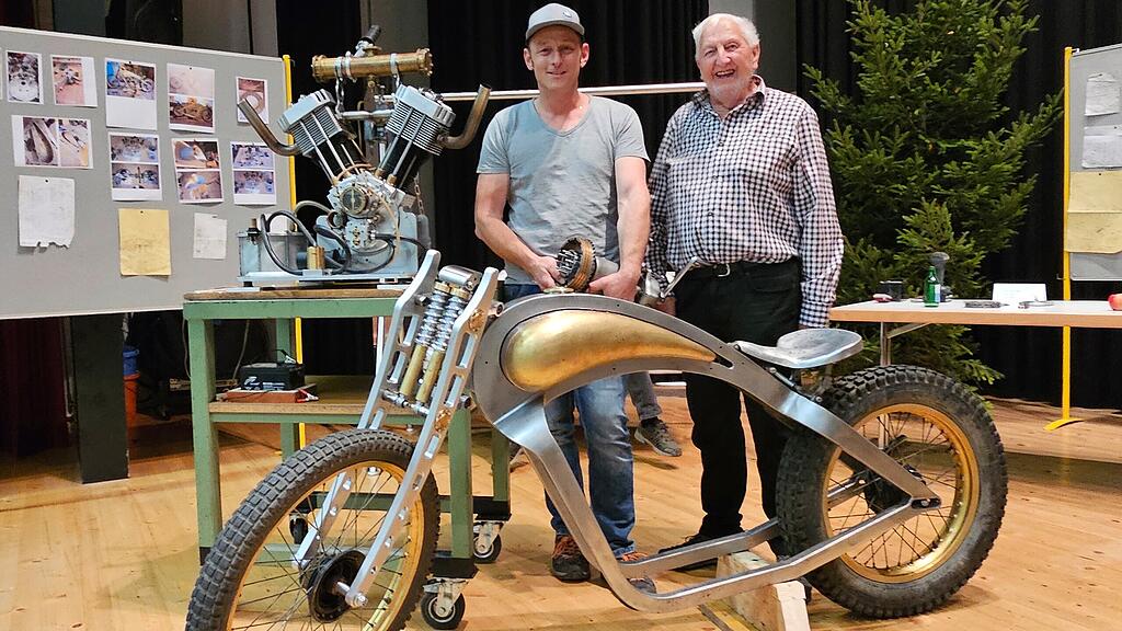 Paul Betschart (links), der von Grund auf einen Töff selbst baut, mit Josef Bürgler, dem OK-Präsidenten der Hobby- und Bastelausstellung in Illgau.