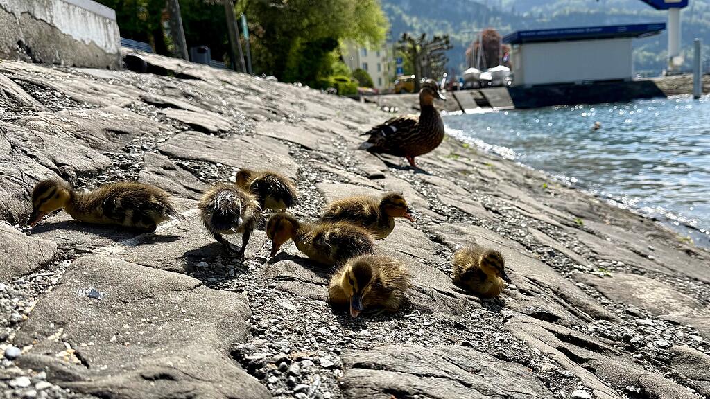 Die kleinen Küken watscheln dicht am Ufer entlang, piepsen leise und wirken unbeeindruckt vom Trubel um sie herum. Kaum tauchen sie auf den Steinplatten beim Brunner Föhnhafen auf, bleiben Spaziergängerinnen und Spaziergänger stehen und zücken ihre Smartphones. Oft bleibt es jedoch nicht beim herzigen Foto. Immer wieder kommt es vor, dass vor allem Kinder die jungen Enten streicheln oder sogar hochheben.