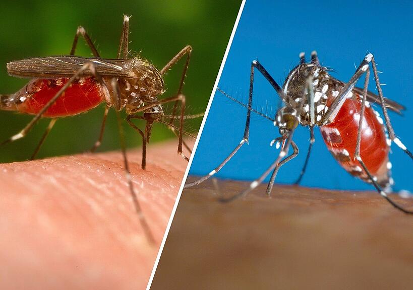 Die beiden invasiven Arten ähneln sich auf den ersten Blick durch ihre schwarz-weisse Musterung – genaues Hinschauen ist erforderlich, um sie unterscheiden zu können. Während die Asiatische Tigermücke einen schwarzen Rücken mit einer einzelnen, markanten weissen Längslinie sowie weisse Enden an den Hinterbeinen besitzt, weist die Asiatische Buschmücke einen braunen Rücken und schwarze Enden an den Hinterbeinen auf. Bei Verdachtsfällen von Asiatischen Tigermücken ist es wichtig, die Mücke zu fotografieren und den Fund online auf muecken-schweiz.ch zu melden.