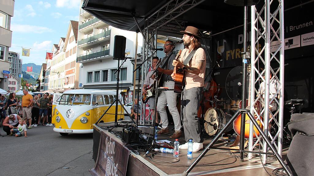 Praktisch alle Sitzplätze rund um die Schifflände waren am Dorf-Fyrabig in Brunnen bei bestem Wetter besetzt. Auch Touristen und Fussgänger waren am Freitagabend am See unterwegs. Vor der Bühne tanzten die Kinder ausgelassen, und das Publikum genoss den schönen Sommerabend bei einem Getränk oder einem Imbiss. Die John Doe Band aus Illgau verstand es, die vielen Zuhörerinnen und Zuhörer mit einem vielseitigen Programm, bestehend aus vielen Eigenkompositionen, aber auch Cover-Versionen, bestens zu unterhalten. Die vier eingeschworenen Jungs der Band erfreuten mit Folk ’n’ Roll und vereinten verschiedene Elemente aus Folk, Country, Rock und Pop. Dabei spielte die Vielfalt der akustischen Instrumente, inklusive Mundharmonika, eine wichtige Rolle, kombiniert mit E-Bass, Kontrabass und Drums. Mit ihrer bodenständigen und unkomplizierten Art und ihrem schönen mehrstimmigen Gesang verstanden sie es, das Publikum zu begeistern.