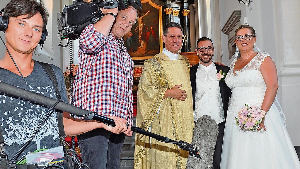 Eines der drei Kamerateams (von links) mit Pfarrer Ugo Rossi und Bräutigam Rino Testagrossa mit seiner Braut Desirée Testagrossa in der Pfarrkirche in Küssnacht.Bilder: Edith Meyer