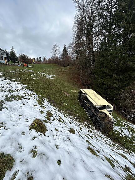 Am Dienstagvormittag fuhr in Vorderthal ein 22-jähriger Chauffeur um 11.30 Uhr mit seinem Lieferwagen auf einer Naturstrasse rückwärts in Richtung Flühstrasse. In einer Medienmitteilung der Kantonspolizei Schwyz heisst es: «Dabei blieb er im Wiesland stecken. Beim anschliessenden Manövrieren geriet der Lieferwagen ins Rutschen.»