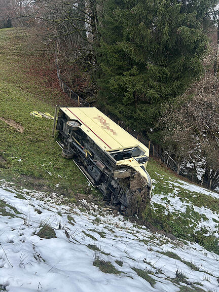 Der Lenker sprang aus dem Fahrzeug, worauf dieses etwa 200 Meter einen Abhang hinunterschlitterte und auf der Seite liegend zum Stillstand kam. Der Chauffeur blieb gemäss Polizeiangaben unverletzt. Am Lieferwagen entstand Totalschaden. gh