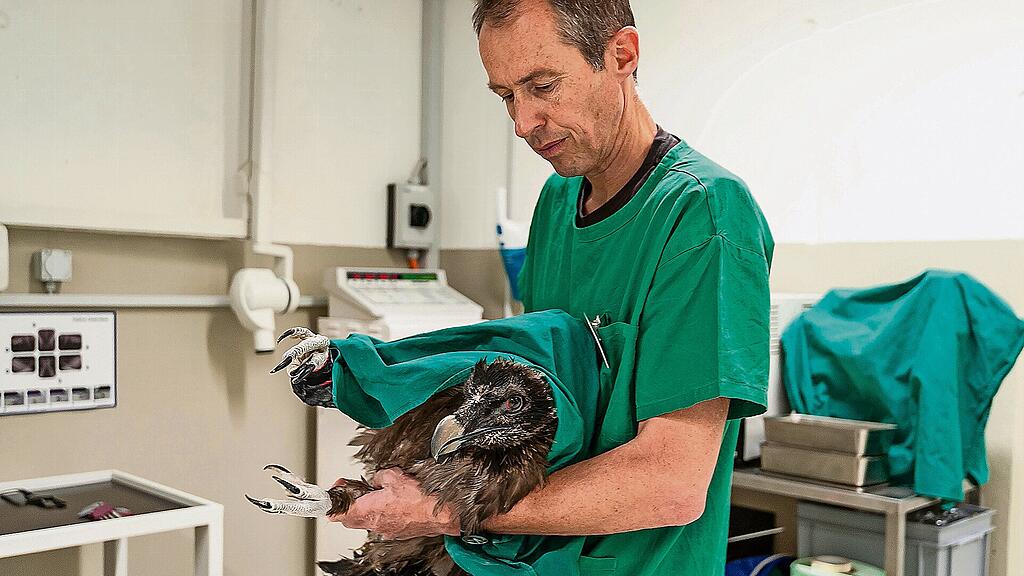 Tierparkarzt Martin Wehrle bei einer Bartgeier-Operation.