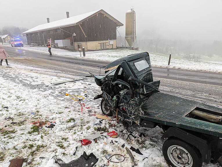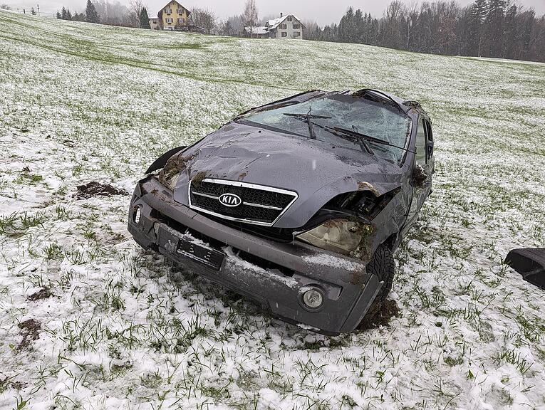 Die Camionette war bei einer seitlichen Frontalkollision mit dem entgegenkommenden Mercedes massiv beschädigt worden. Fast gleichzeitig geriet ein paar Meter weiter oben der Kia von der Fahrbahn. Der Wagen war gemäss den Spuren Richtung Bernerhöhe unterwegs, als er rechts über den Abhang stürzte. Das Auto überschlug sich und kam demoliert mit eingedrücktem Dach wieder auf den Rädern zum Stillstand.
