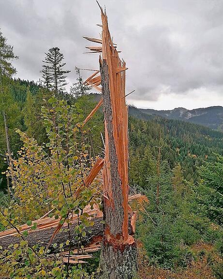 Der Baum hat den böswilligen Eingriff nicht überlebt. Dem Sturm in der Nacht auf Donnerstag hielt der geschwächte Nadelbaum nicht mehr stand. Er zerbrach bei der zugefügten Schadstelle und stürzte um.