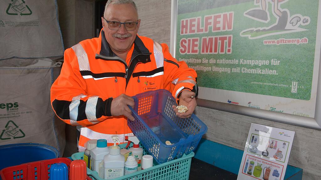 Sepp Stirnimann bei der Annahme von Sonderabfällen im Ökihof in Küssnacht. Er entsorgt hier abgegebene Medikamente.