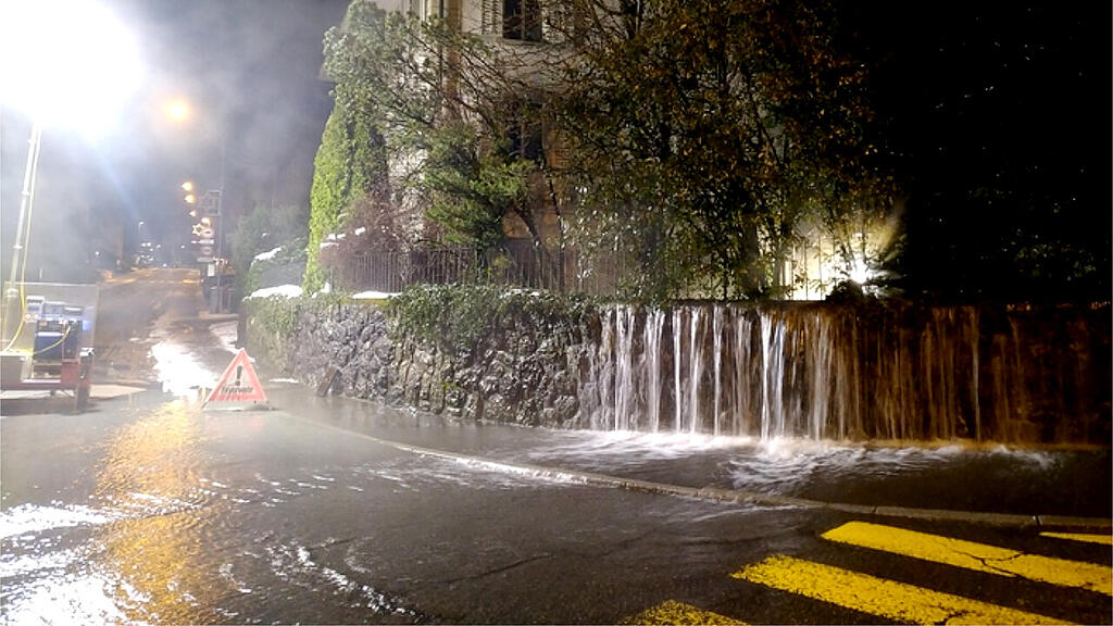Es hätte eine Attraktion in einer Hotellobby in Las Vegas sein können. An der Bahnhofstrasse in Goldau ergoss sich am frühen Morgen des 24. Dezembers ein mehrere Meter breiter Wasserfall über eine Steinmauer. Unüberhörbar plätscherte das Wasser aufs Trottoir. Gleich nebenan lief der nächtliche Autoverkehr.