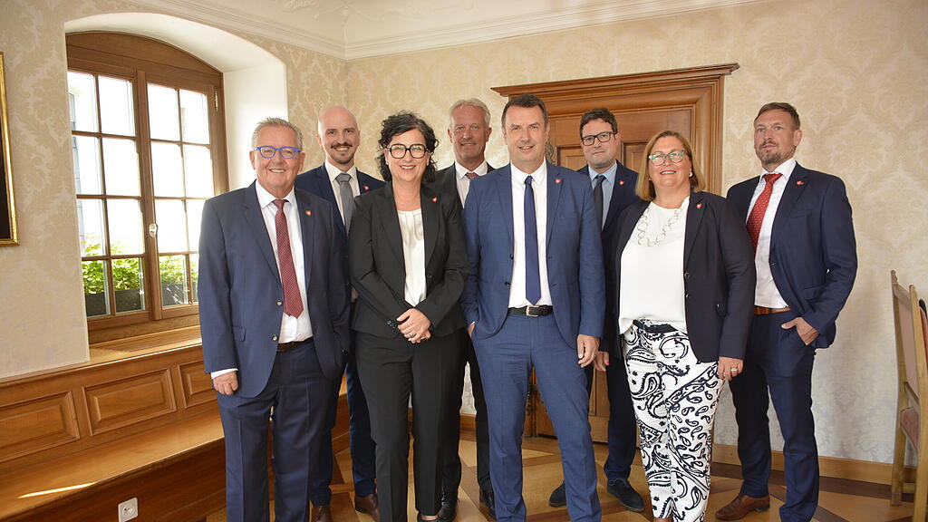Die Mitglieder des Bezirksrates mit dem Landschreiber (von links): Säckelmeister Peter Küng, Bezirksrat Toni Schuler, Frau Statthalter Petra Gamma, Bezirksrat Roman Schlömmer, Bezirksammann Oliver Ebert, Landschreiber Marc Sinoli, Bezirksrätin Sibylle Hofer und Bezirksrat René Hunziker, der suspendiert wurde.