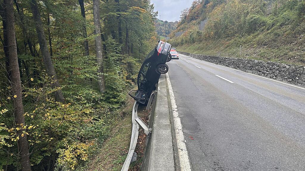 Das Bild sieht heftig aus, doch glücklicherweise gab es keine Verletzten: Letzte Woche fuhr ein Auto auf der Grundstrasse von Muotathal nach Schwyz und überholte auf der Strecke zwischen Schlattli und Horärank. Gleichzeitig wollte aber ein anderer Wagen, von der Strasse von Aufiberg herkommend, auf die Grundstrasse nach Schwyz einbiegen.