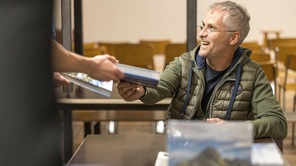 Autor Xaver Büeler freut sich an der Vernissage, seine Bücher mit einer persönlichen Signatur zu versehen.
