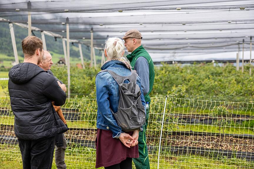 Anita und Michael Reichmuth-Caduff leiten den Hof in der dritten Generation und haben mittlerweile über 40 Angestellte. Was mit einem kleinen typischen Bauernhof begann, umfasst heute 30 ha Gemüse, 2 ha Beeren, 2 ha Obst, 4 ha Kartoffeln und 1 ha Dinkel. Der Rundgang führte durch all diese Felder, wo diverse Einblicke präsentiert wurden.