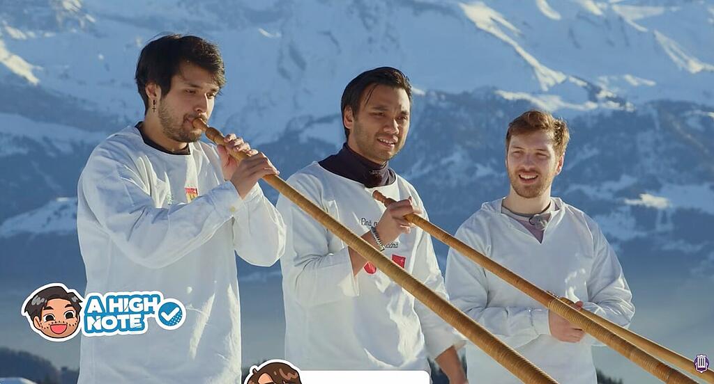 Joey Bizinger, Garnt Maneetapho und Connor Colquhoun starteten in Brunnen und fuhren Kanu auf dem Vierwaldstättersee, brätelten einen Cervelat und saunierten in Brunnen in Jurten. Anschliessend gings hoch auf die Rigi, wo sie das Alphornspielen zu lernen versuchten und einander auf einer Sänfte trugen.