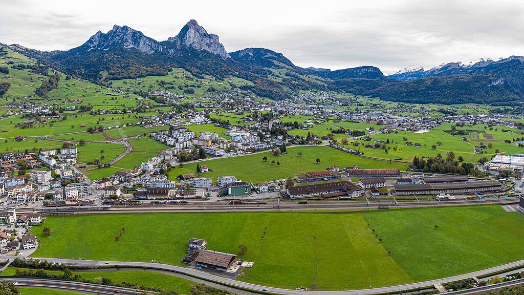 Vom Bahnhof in Seewen (links) erstreckt sich das Areal entlang der Bahnlinie.
