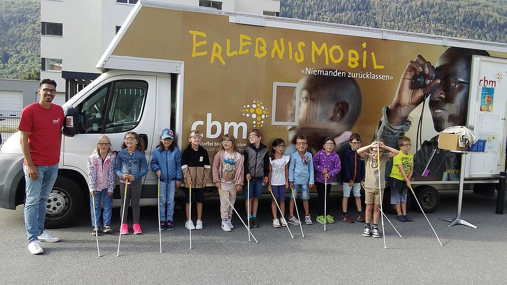 Wie man sich ohne Sehvermögen orientiert, erfuhren Schwyzer Kinder im Erlebnismobil der Blindenmission.