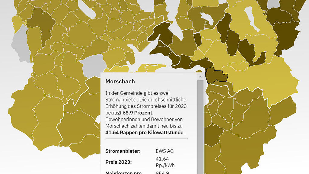 Strom wird teurer. Das ist klar. Jetzt ist aber auch bekannt, wo es am teuersten wird. Die Elektrizitätskommission (Elcom) hat erstmals eine Übersicht aller Stromtarife in den rund 2150 Schweizer Gemeinden veröffentlicht. Diese Tarife gelten ab dem 1. Januar 2023 für Kunden, die den Strom in der sogenannten Grundversorgung beziehen – was die meisten Haushalte betrifft.