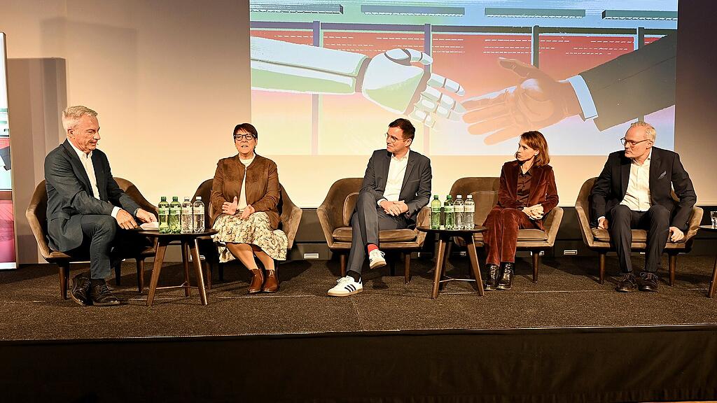 Diskussionsrunde über KI. Von links Moderator Reto Lipp, Regierungsrätin Petra Steimen-Rickenbacher, Florian Artinger, Simply Rational GmbH, Barbara Bleisch, Philosophin und TV-Moderatorin, und Thomas Truttmann, CEO Felchlin AG, Ibach.